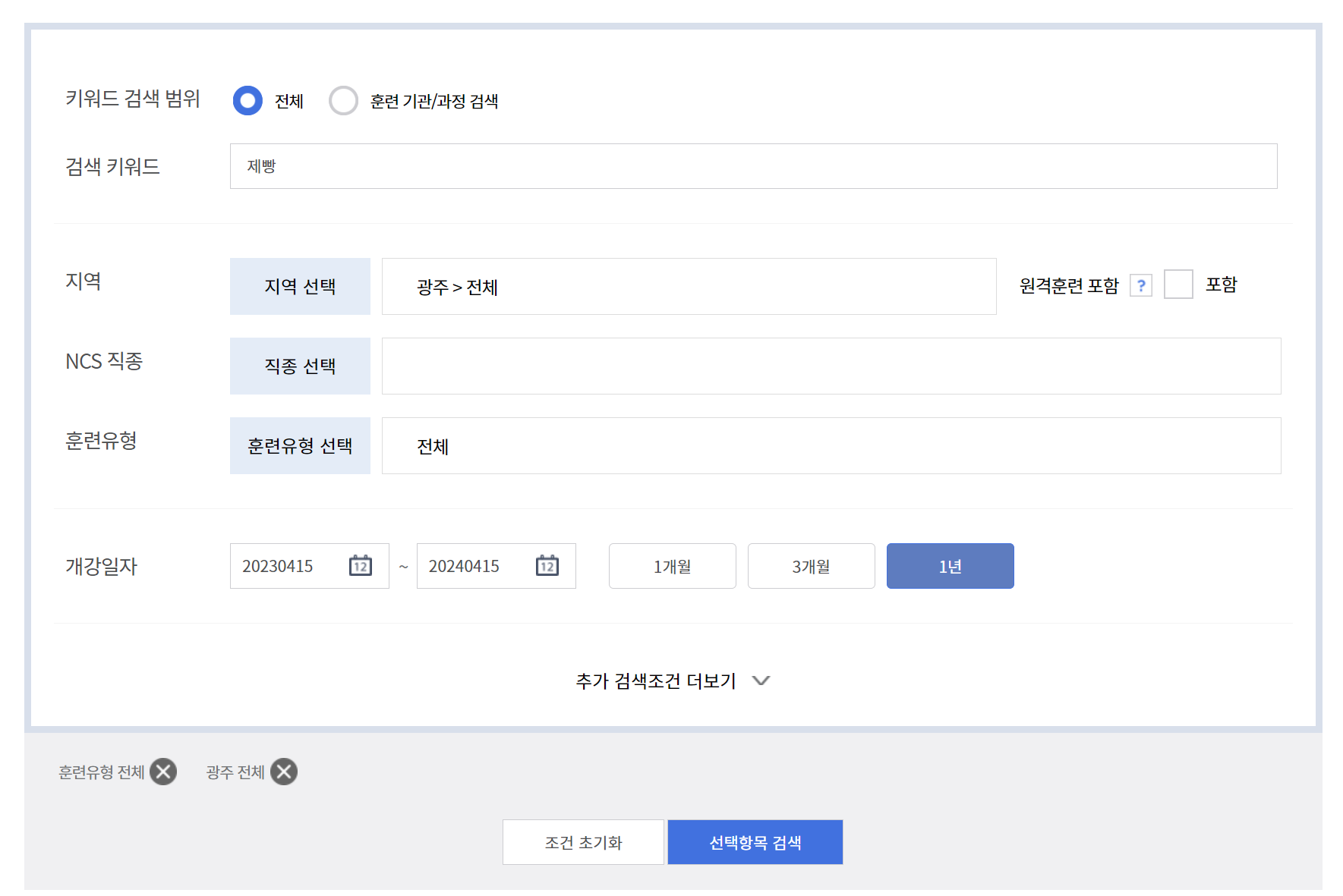 예를 들어 광주지역에서 제빵에 관련된 과정을 찾는다면 키워드를 제빵으로 지역을 광주로 선택하고 선택항목 검색을 눌러주면 광주지역에서 제빵관련하여 배울 수 있는 과정들을 찾을 수 있습니다.